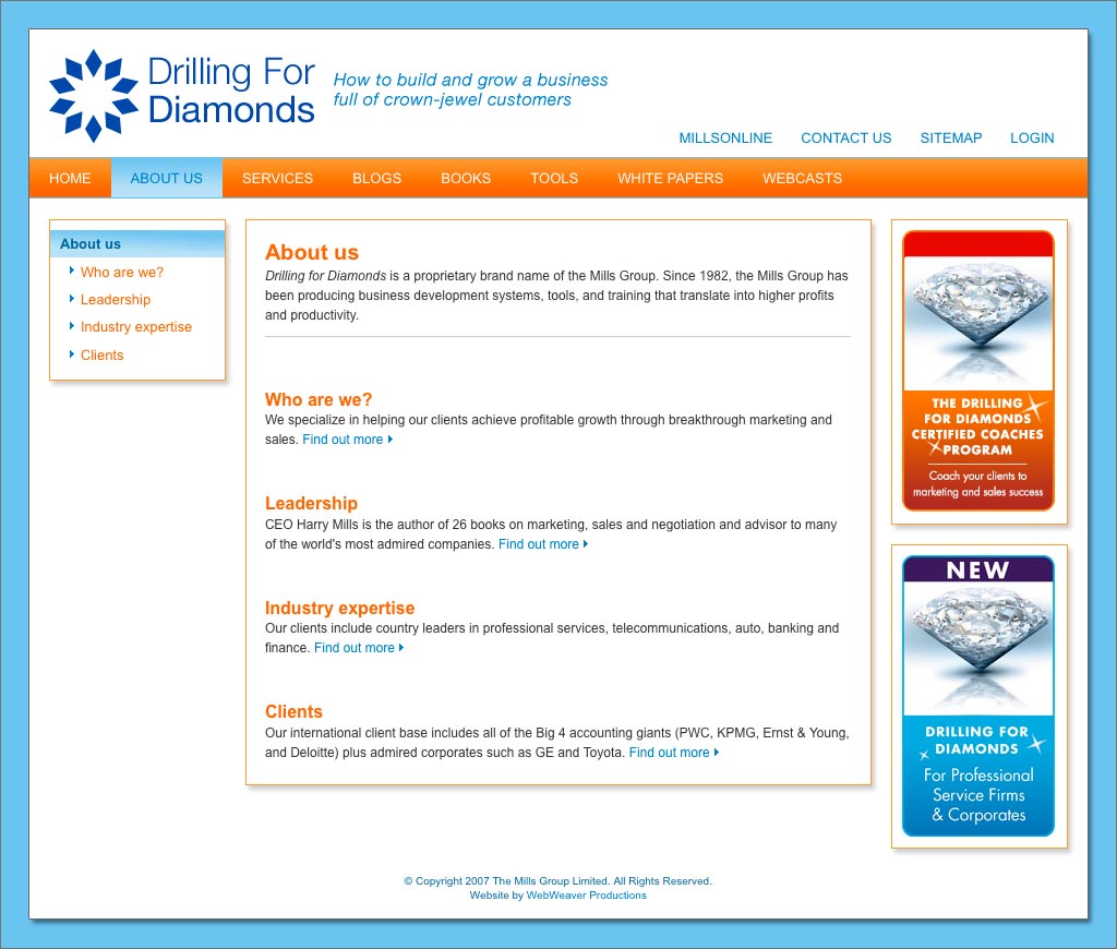 Brief: to design and build a new website for The Mills Group which would both promote their Drilling for Diamonds online coaching products and act as a secure portal through which D4D coaches could train staff.