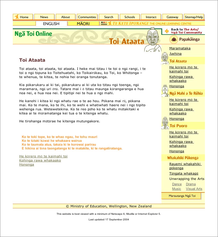 Brief: to make extensive alterations (mostly in te reo) to the text within this large subsite which was part of CWA's Te Kete Ipurangi portal website. Ngā Toi Online had two versions - English and Māori - as did most of TKI. However, changes had been made which left the two versions inconsistent with each other. This project sought to restore both parts of the site to a bilingual mirror of each other.