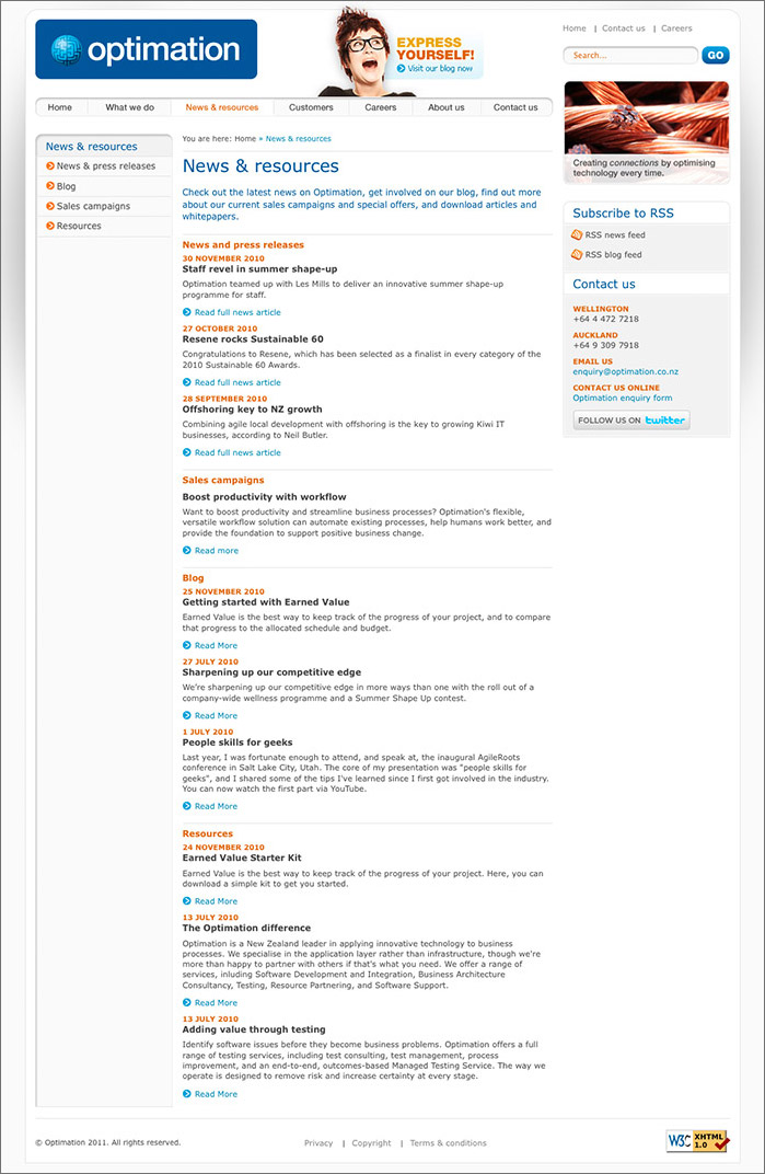 - Ongoing liaison with the Optimation web team, to ensure that the new templates and backend functionality were working as expected, and to provide additional HTML, CSS and content graphics as required.