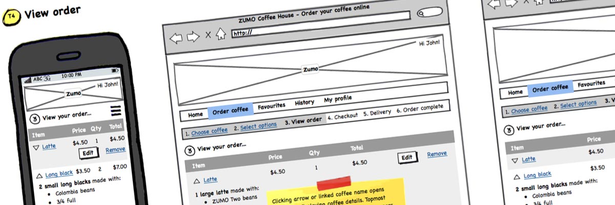 - Reviewed the coffee-ordering process in detail and broke this down into a series of steps, carried out the content design for each step, then successfully developed a set of wireframes that reflected that process and translated it into a set of web pages for the client